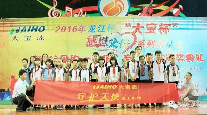 5月20日,由佛山龍江鎮教育局、龍江鎮關心下一代委員會與大寶漆共同主辦的2016年龍江鎮“大寶杯”感恩父母系列活動之“給父母的一封信”有獎征文頒獎典禮在龍江鎮城區中心小學舉辦。佛山龍江鎮教育局和龍江鎮關心下一代委員會在頒獎典禮上授予大寶漆“博愛慈懷熱心公益”稱號。大寶化工企劃部楊忠榮副理、龍江鎮關心下一代工作委員會麥煥橋主任、獲獎小學生及其家長出席了本次頒獎典禮。
