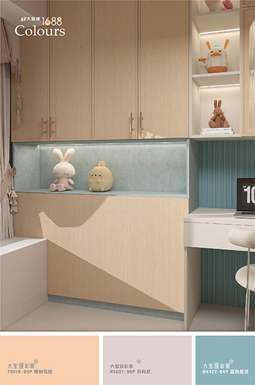 不僅適合打造大面積的墻面背景,也能作為點綴色,用于打造清新視覺焦點。配大寶設彩家推薦的輔助色如絳紅、滄海一栗、裸膚色、藍灰色等低飽和色系,亦可運用漸層疊加或撞色的涂裝方式,打造豐富卻不突兀的空間層次感,為家注入靜謐又富有生命力的夏日氛圍。